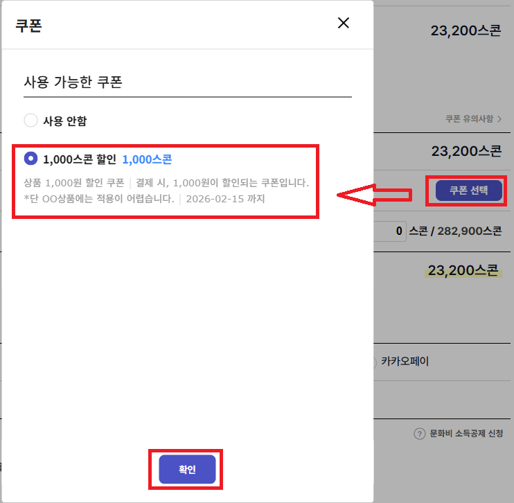 ② 원하는 쿠폰을 선택하고 적용해 주세요.