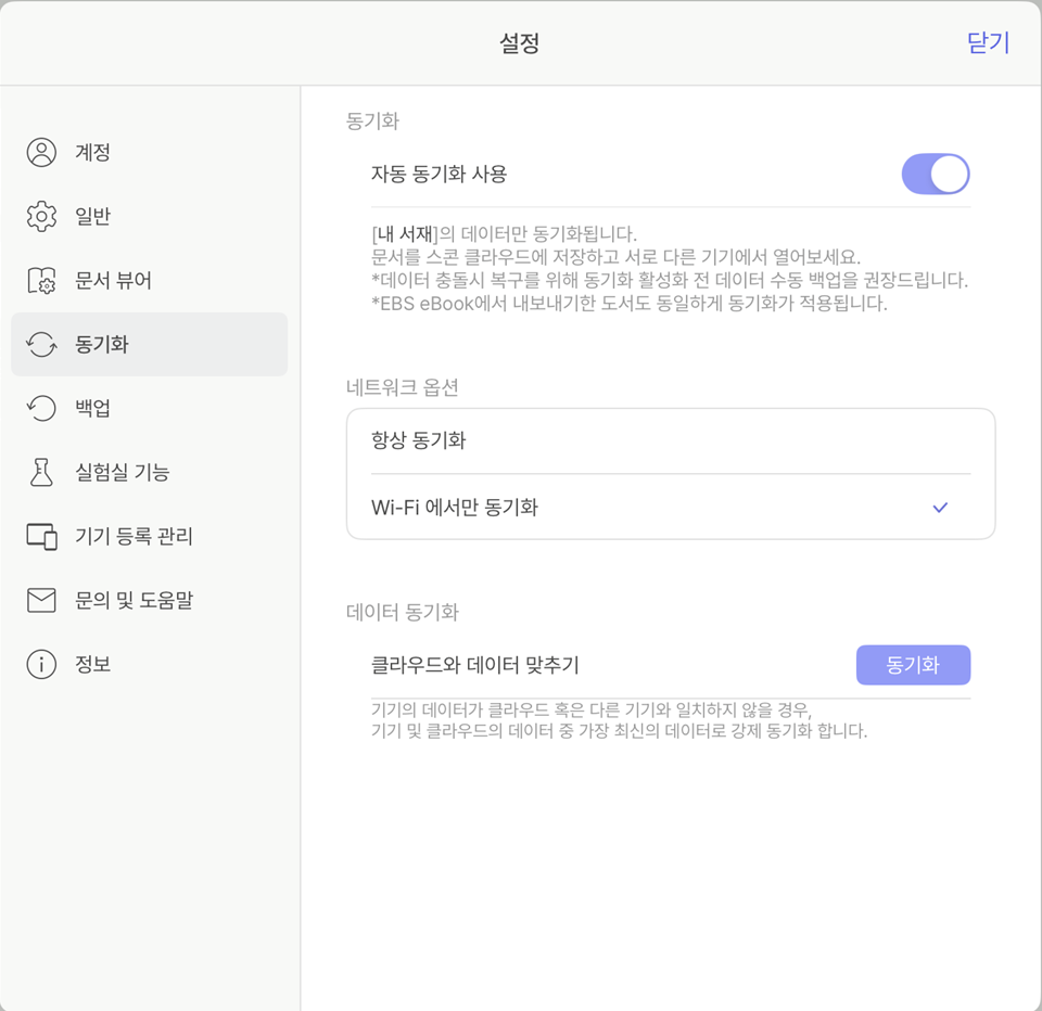 - 끄기 : 스콘 앱 > 설정 > 동기화 > 자동 동기화 사용 > 비활성화