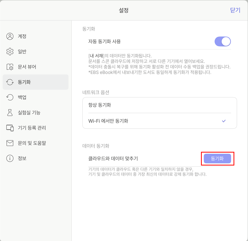 [스콘 앱] 다른 기기와의 필기 내용이 안 맞아요. February 09, 2026 10:06 Updated A기기와 B기기가 있을 때를 가정합니다. A기기의 데이터 : 최신B기기의 데이터 : 최신이 아님 B기기의 스콘 앱 > 설정 -> 동기화 -> 클라우드 데이터 맞추기를 통해 시도 해 주세요. Related articles [스콘 앱] 동기화 기능이 궁금해요 [스콘 앱] 동기화 데이터가 여러 개 있는 것 같아요. ⭐만약 오류가 발생했다면 함부로 앱을 삭제하지 마세요⭐ [스콘앱] 데이터 백업, 복원_도서, 개인파일 ★ [스콘앱] 필기 기능 List (펜 모드/제스처 모드/제스처 List/레퍼런스 링크/키보드 단축키)