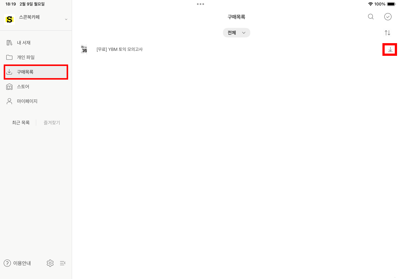 ② 스콘앱 > 구매목록 에서 원하는 도서를 선택하여 다운로드해 주세요.